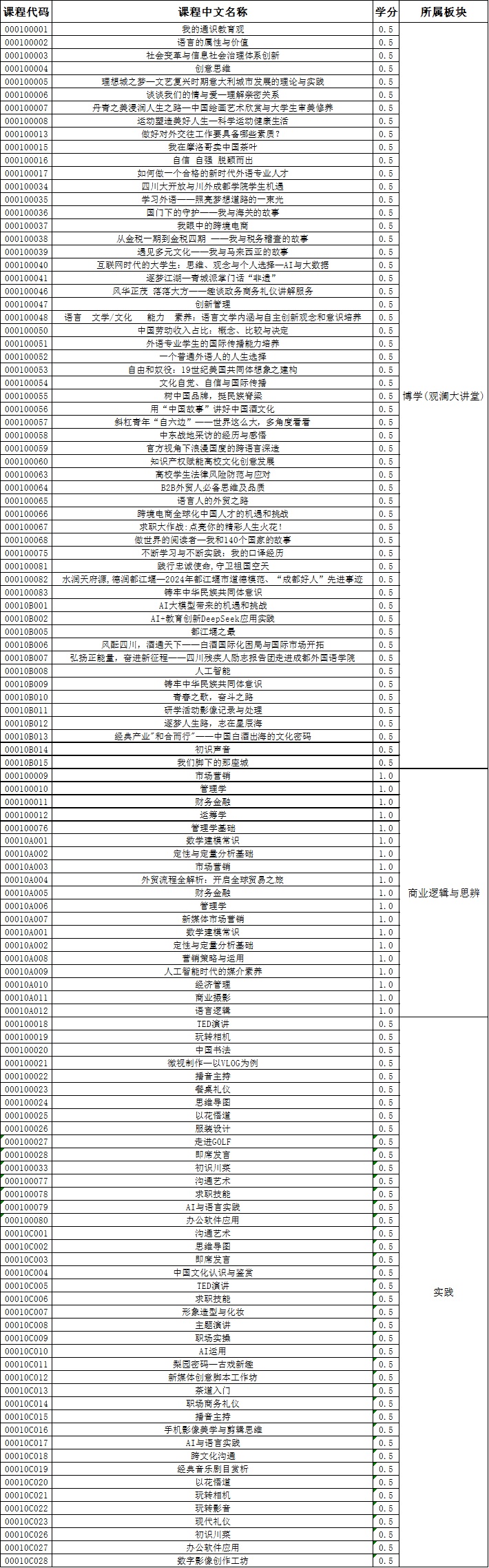 成都外国语学院通识教育课程名单